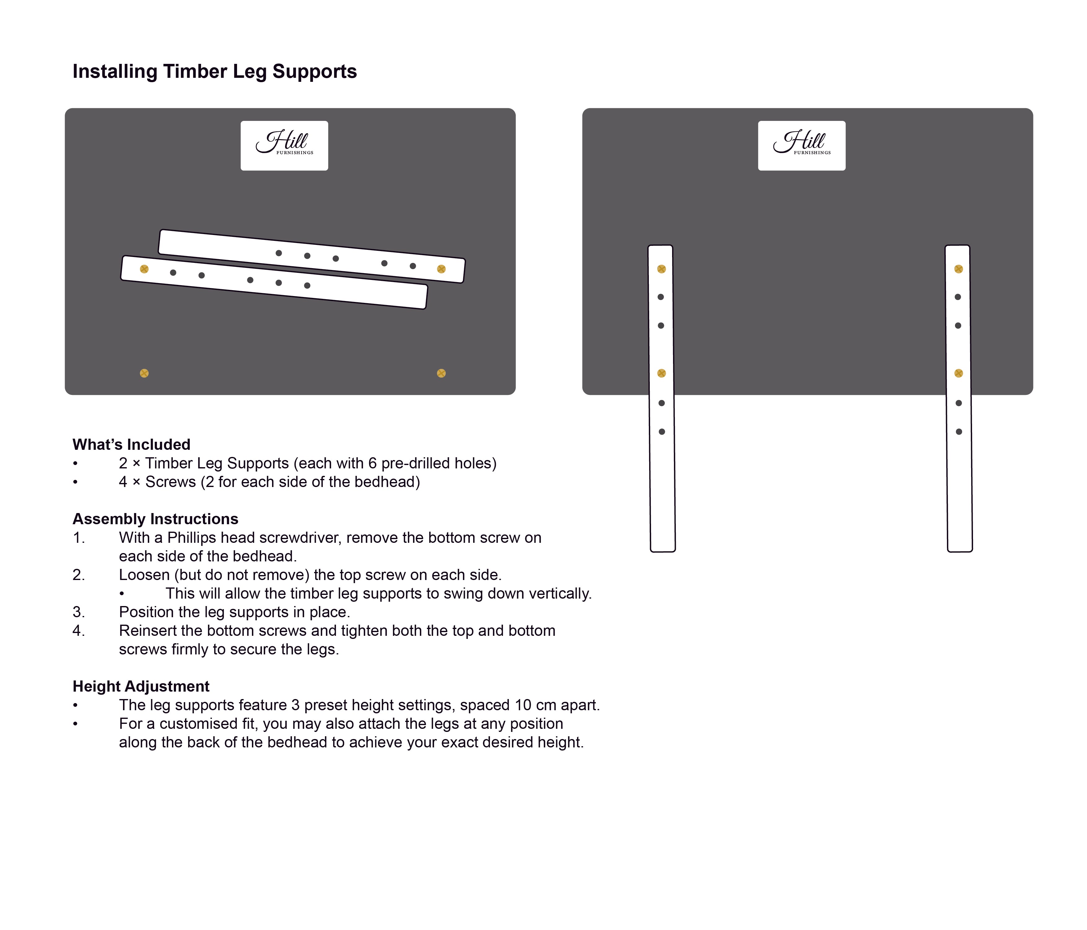 Your bedhead will come with free standing, height adjustable leg supports to suit any ensemble height. Included with these are the screws which attach the legs to the back of the bedhead and anti-topple anchors which attach it to the wall if required. The easiest option is to attach the legs to the back of the bedhead using the existing pre-drilled holes. For a more exact height, measure the distance to the floor and make new holes by screwing the legs anywhere into the back of the bedhead panel. Freestanding legs are the easiest installation method and drilling into the wall is optional.