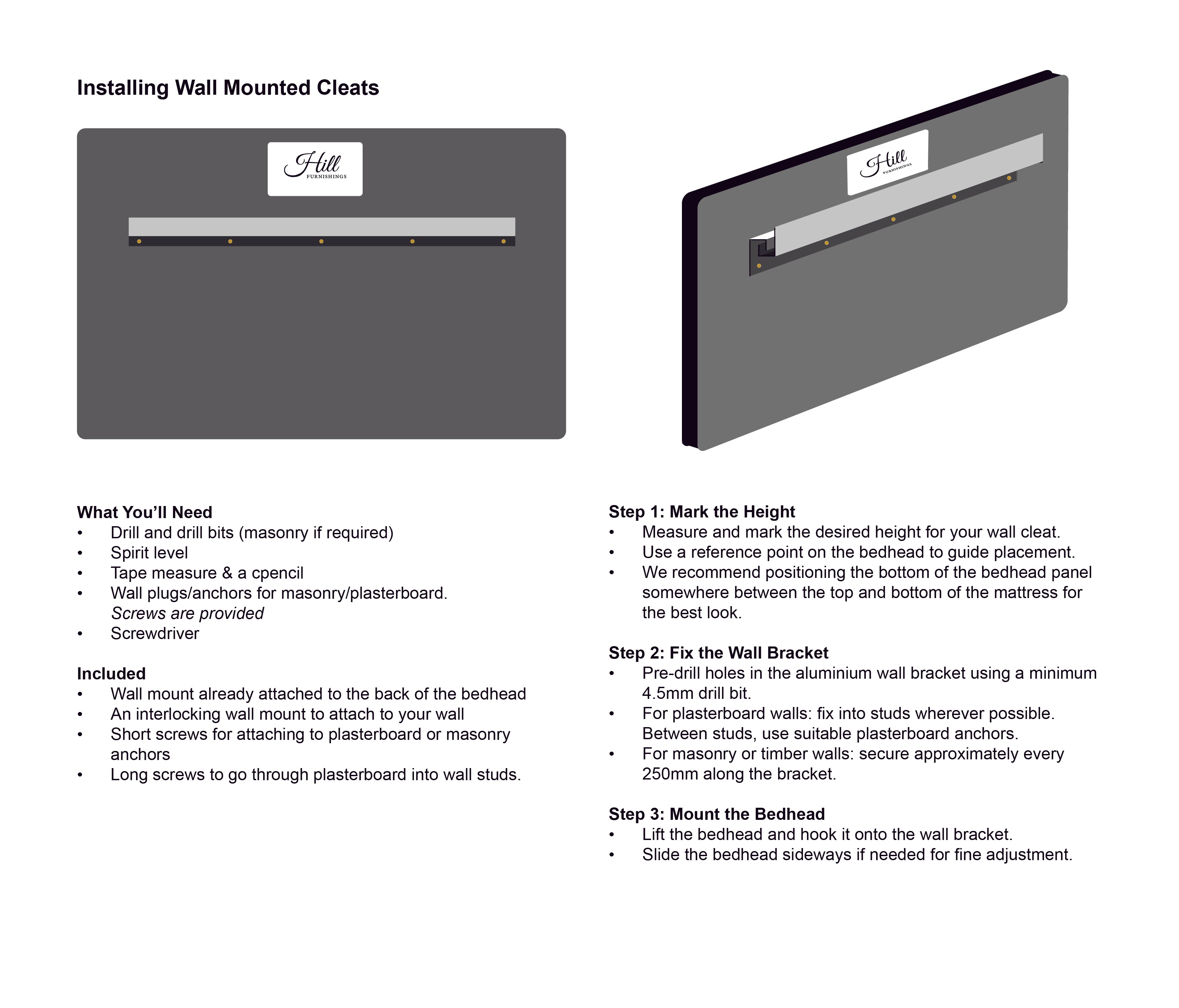 Your bedhead will come with aluminium cleat brackets. One will be attached to the back of the bedhead already and the other attaches to your wall at the height you desire. We recommend that you screw through the wall bracket into the wall every 22.5cm. eg if going onto a plasterboard wall, screw into studs and also between each stud using plasterboard anchors. Screws are included for this however, you may require different or additional screws and anchors depending on your wall type. This option will make your bedhead more flush with the wall as the aluminium brackets are not as thick as the leg option.