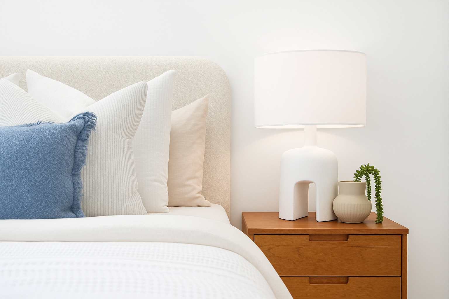 Our Boucle Curved Low Rise Upholstered Bedhead is crafted for comfort. Designed to endure, this boucle upholstered bedhead brings understated sophistication to the bedroom with its gently curved silhouette and soft, luxurious upholstery. This low-rise design grounds the room with its soft, tactile finish. Made to order in Australia, the Boucle Curved Bedhead is built to last and generously padded for style and comfort. Its minimal profile makes it the perfect complement almost any interior.