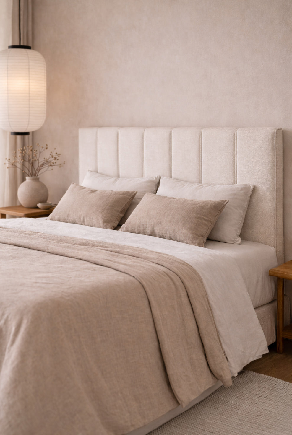The evenly spaced vertical joins elongate the bed visually, adding height and quiet impact without overwhelming the space. It’s a statement through precision — not excess.